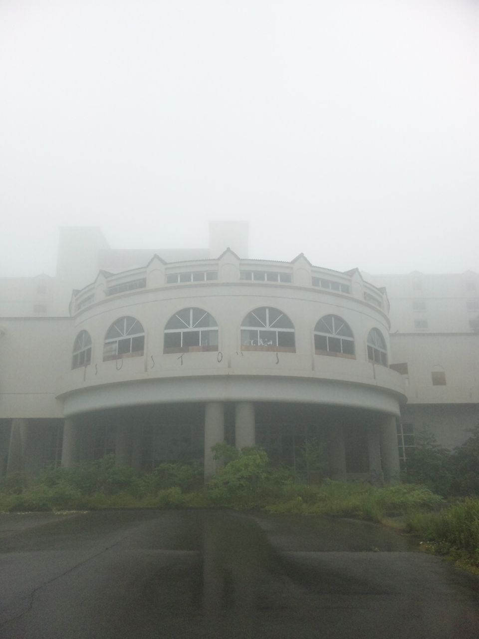 皆川博子の小説にこんなタイトルのがあったな。デビュー作か。 相変わらず写真がアップできないので携帯より投稿。 俺にとっての理想郷(アルカディアはギリシャで理想郷とされていた)を再訪(といっても初訪の翌日)したときのこと。 山を車で上って行くと10m先も見えないような深い霧がでてきた。 潜入には持ってこいのシチュエーション。 車をとめ、敷地内を歩き出すもののホテルはなかなか見えず。ホテルの前にある広場に到着したところで顔を上げると、顔を半分だけ出したホテルが見えた。 それこそ幻想小説に出てきそうな風景だった。 ここは敷地外部に塀があるため外からの視線を感じることはない。 完全に一人だということで堂々とホテル内部突入を試みる。 前日散々イメージした潜入方法を試すが、やはりキツイ。 2mの高さを昇った後、割れたガラスの間をくぐるか有刺鉄線を超えるしかない。 ロッククライミングよろしく手の置場、足の置場を確認してよじ昇る。 壁の向こう側への着地はできそうだ。 中を覗けばガラス張りのエレベーターに手すりのない階段が見える。 さぁここを越えれば理想郷が待っている!! しかし、最大の問題が残されていた。 中から外への脱出方法が見つからない。 いや、腕力があれば打ち付けられた壁に手をかけ、よじ昇れば行けるのだろうけど、俺にそれはない。 色々考えているうちに手がプルプルしてきたので一旦地面に戻る。 地面には割れたガラスが散乱している。慎重に降りないと着地したときに怪我の可能性もあり。 となると、必殺技で脚立を買うか。でも中に持ち込めるか?可能性は低い。 これが二人なら可能なんだけどなぁ。 どうする? それでも入るか? 諦めるか? 何度も昇っり降りたりを繰り返していると、なにやら音がする。 「ウィーーーーン。ガーッガリッ。」 今まで気づかなかったけど、けっこう近くだぞ。 音がする方向をに目を向けるが、霧のため何も見えない。 途切れ途切れに聞こえる音。 音から察するに何やら木を電ノコで切ってるみたいだ。木というより木の板を。 もしや同業者か、はたまた市の職員か。しかし話声が聞こえない。やはり同業者か。 どこかの入口を開けてくれてるならご一緒したいが、どんな人かもわからないため、そこで退散を決める。 40分程の滞在。 結局、岡山では潜入できたのは虹のホテル1つのみ。 この未完成ホテル、なんとしてもリベンジしてやる。